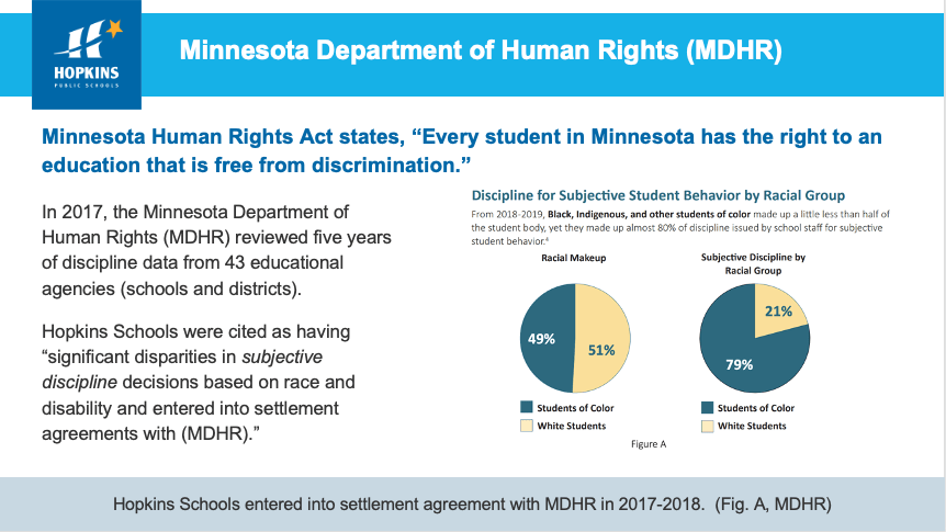 On December 20, 2022, a Restorative Culture Update1 was provided to the Hopkins School Board during its Workshop session. The primary presenter was Maria Bearre-Boynne, the District Restorative Culture Coordinator. Ms. Bearre-Boynne used a graphic taken from the 2022 MDHR Report that I addressed in a prior post, as shown below, that pointed out disparities in subjective discipline across the State of Minnesota (with MDHR having changed the metric from exclusionary discipline to subjective discipline).
