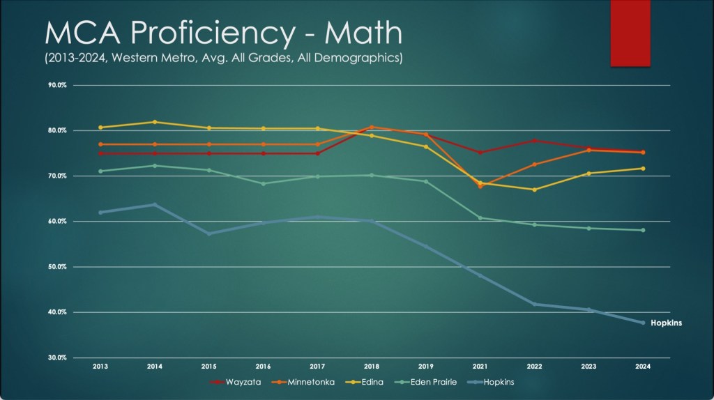 To put it bluntly, Hopkins is in academic decline. From 2013-2024, while other Western Metro districts maintained relatively stable MCA proficiency test rates and are well on the pathway to recovery from the pandemic. Hopkins, however, has been experiencing steep drops in academic performance across all major subjects and student demographics.