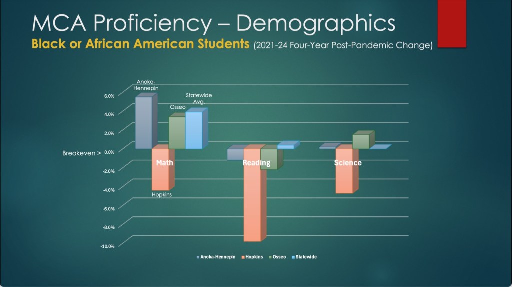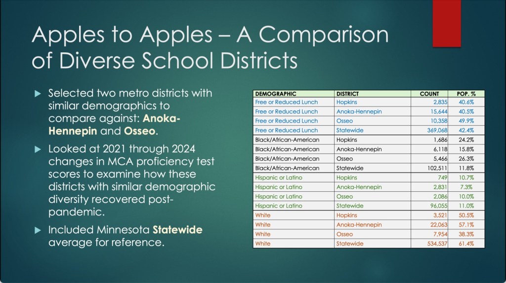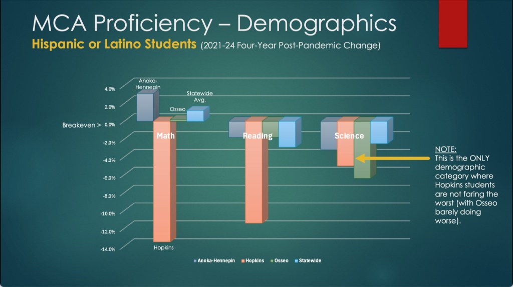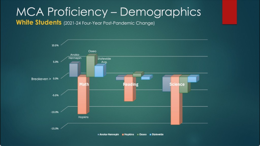 The data indicates that changes in student demographics over the past 25 years cannot explain this academic decline, particularly with other diverse districts such as Anoka-Hennepin and Osseo demonstrating drastically stronger performances than Hopkins across all MCA subjects from 2021-2024.