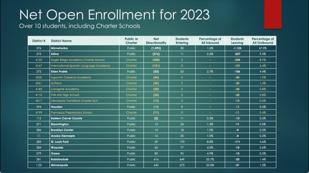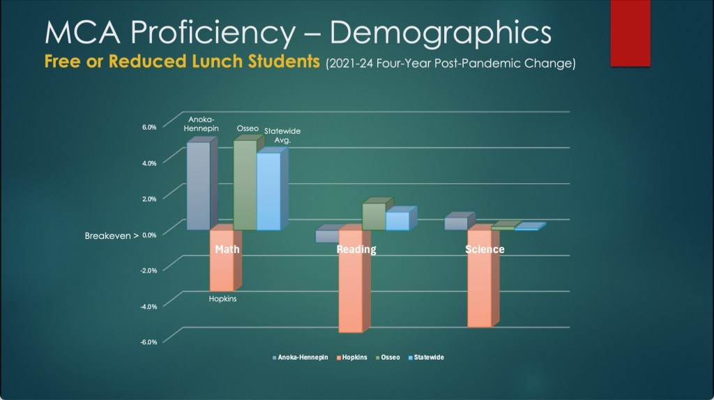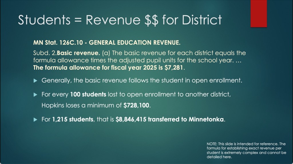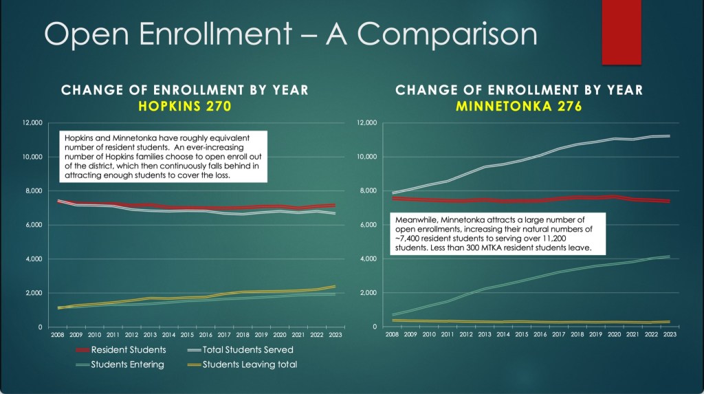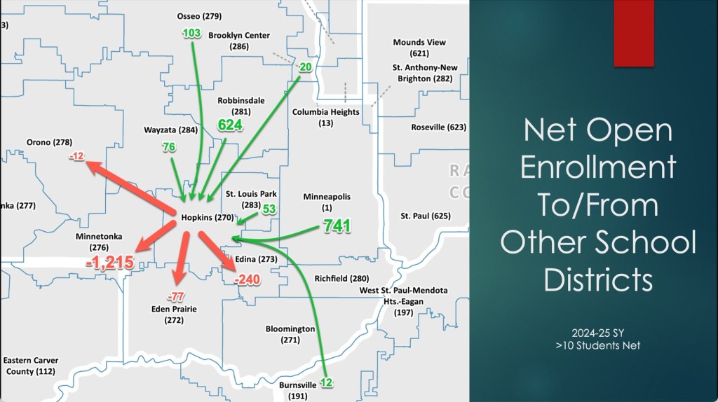 Also quite concerning is the enrollment exodus. Hopkins is hemorrhaging students to neighboring districts, particularly Minnetonka, which gained over 1,200 students at Hopkins’ expense. My calculations suggest that represents approximately $8.8 million in lost revenue annually – money that could fund crucial educational support as we face reductions in courses, faculty and paraprofessionals in our classrooms.